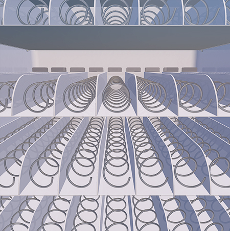 這類售貨機在市場上最為常見,通常使用來售賣零食、飲料,通過彈簧推動商品使其出貨。這是一種最簡單、成本最低的貨道,一個彈簧道內至少可放置五件商品,容量較大。但是這種貨道的缺點是商品容易掛在貨道上或卡在出貨過程中,尤其是瓶裝飲料。